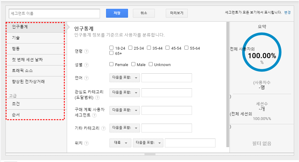 해당 '세그먼트' 버튼을 누르게 되면 아래와 같은 세부항목이 표기됩니다