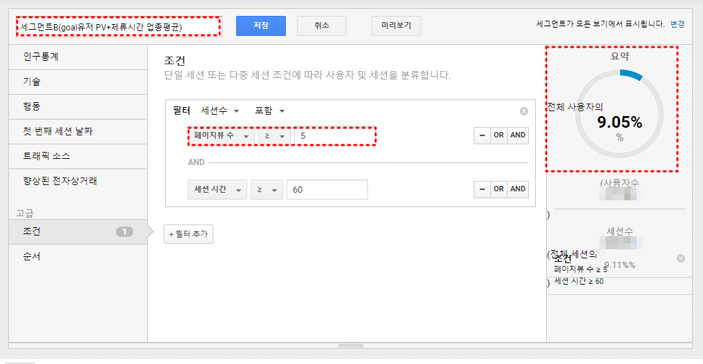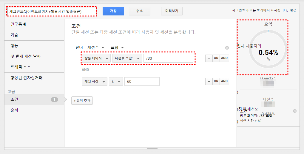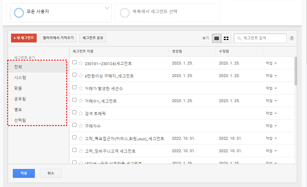 애널리틱스에서 기본적으로 제공하는 '시스템 세그먼트'는 그대로 분석 용도에 맞게 사용하면 되겠지만