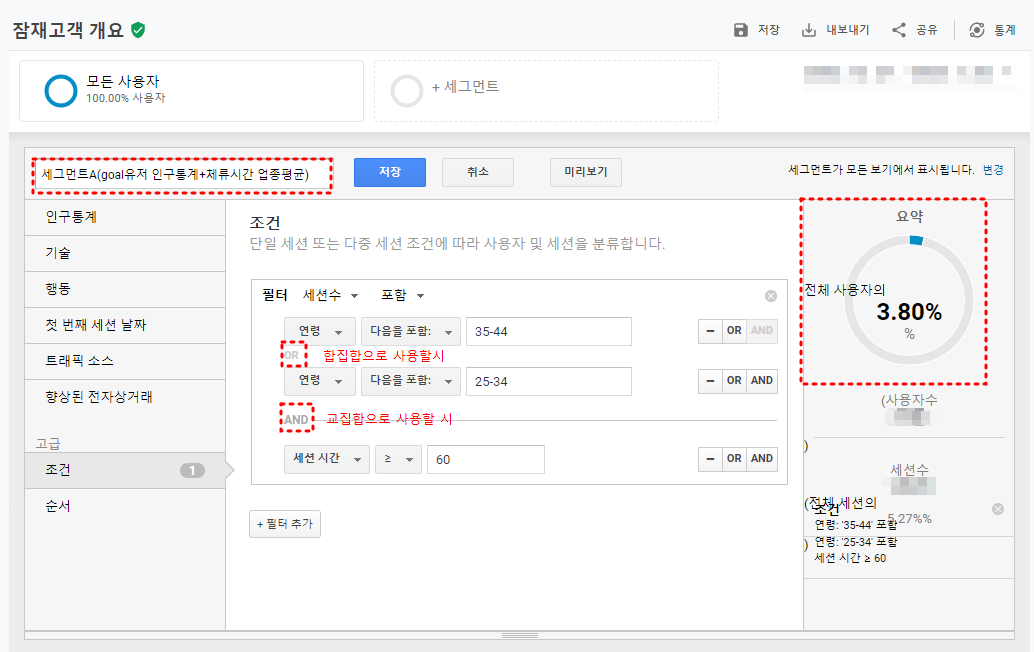 '새 세그먼트'를 클릭하면 위와 같은 세부항목이 표기되며 '간단한 설명'은 아래를 참고하시면 됩니다.