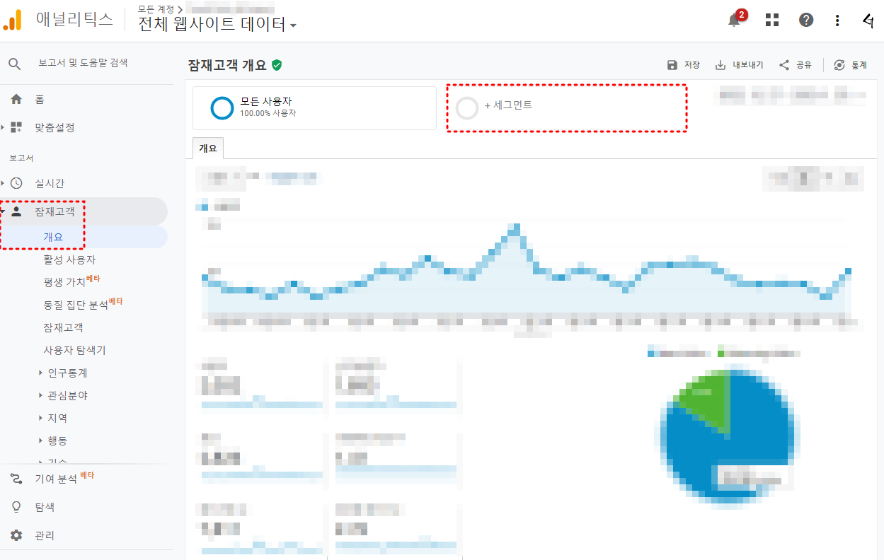 세그먼트는 위에 '잠재고객-개요' 카테고리를 포함해서 대 부분의 분석 화면 제일 상단에 표시되어 있고