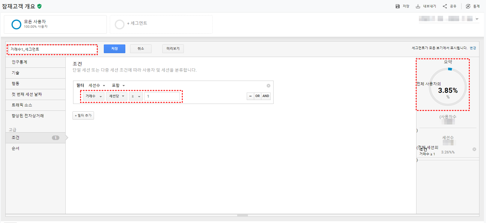 goal이 구매인 경우 '전자상거래' 연결 후 '거래수 >=1'로 설정후 세그먼테이션